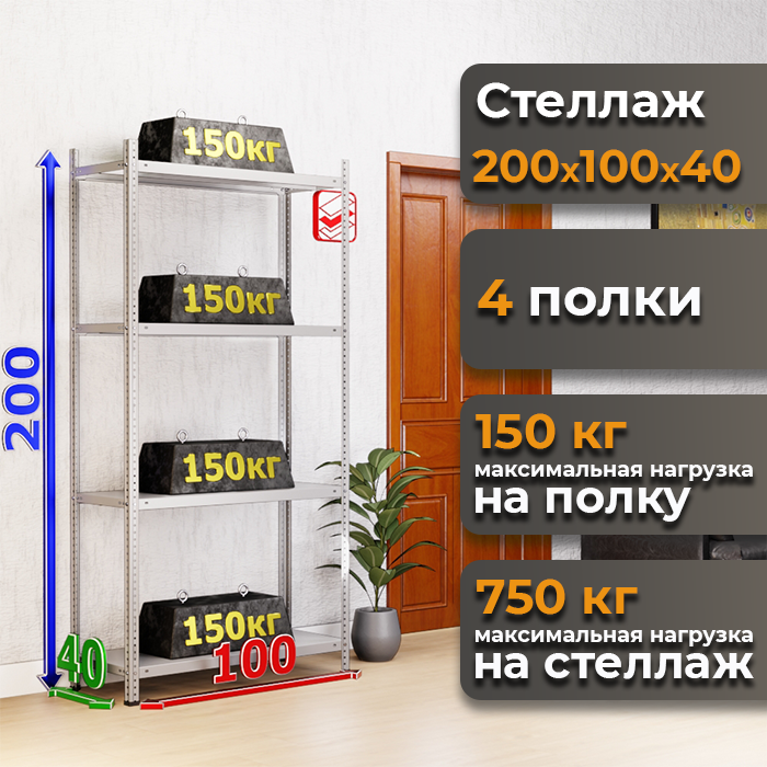 Стеллаж складской металлический высотой 200 см, шириной 100 см, глубиной 50 см, с четырьмя полками и максимальной нагрузкой до 150 кг, купить в Москве ;