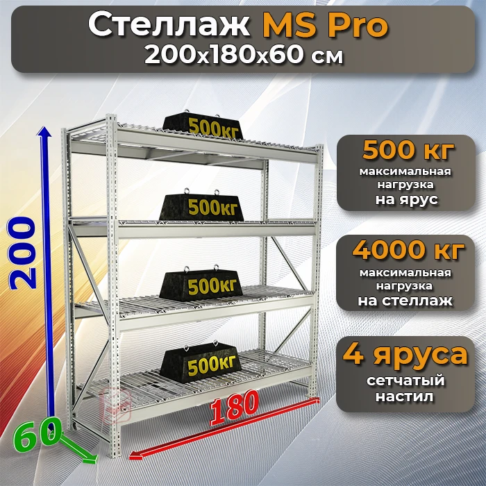 Стеллаж складской с четырьмя полками MS Pro 200х180х60 с сетчатым настилом — это идеальное решение для надежного и функционального хранения грузов. Конструкция сочетает прочность и универсальность, что делает стеллаж подходящим для использования как на складах и производствах, так и в гаражах, кладовых и торговых точках.